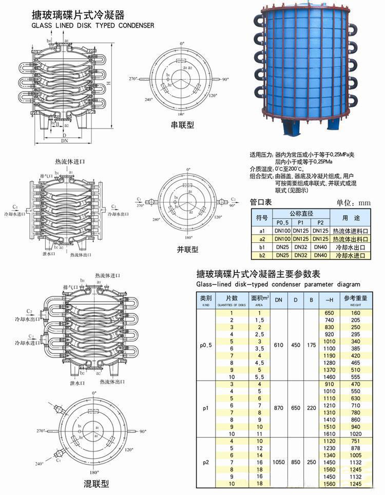 1、搪玻璃碟片式冷凝器分P1型及PO. 5型兩種型號。伶凝面積P0.5型,每片為0.5平方米,設備外徑為700mmo P1型,每片冷凝為1平方米,設備處徑為960mm。定型規(guī)格為1. 5-15平方米系列,可根據(jù)所需冷凝量來選擇。