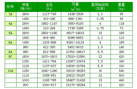 A式為葉輪和電機(jī)直聯(lián),C式二種,900轉(zhuǎn)-1250轉(zhuǎn)為軸座傳動(dòng),1250轉(zhuǎn)-1600轉(zhuǎn)為軸承箱傳動(dòng)